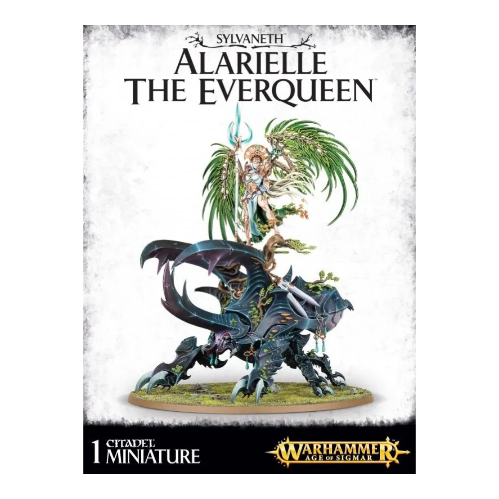 Este kit multicomponente de plástico contiene todas las piezas necesarias para montar a Alarielle, la Reina Eterna, montada sobre su gigantesco wardroth; un ariete viviente cubierto de musgo y hongos, y cargado de ánforas del alma y otras alhajas. Ella empuña la Lanza de Kurnoth en una mano y su otro brazo acaba en la temible garra de la pérdida. Un total de 79 piezas, más una peana redonda Citadel de 160 mm, un tamaño acorde al de la enorme miniatura.