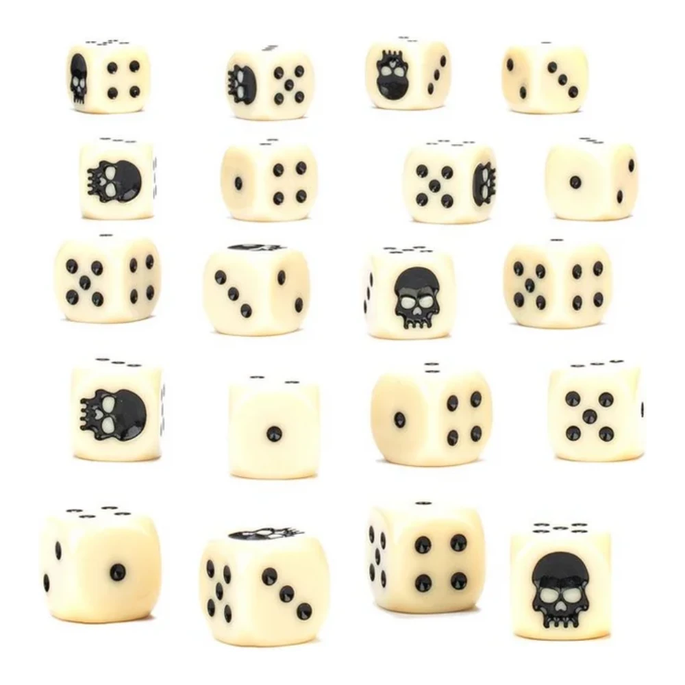 Un juego de 20 dados de seis caras con bordes redondeados para Warhammer 40,000, Warhammer Age of Sigmar, Warhammer: The Horus Heresy, Warhammer: The Old World y otros sistemas de juego. Están fabricados en plástico acrílico de color marfil con muescas en tinta negra y miden 12 mm de arista. Las caras del 1 al 5 muestran las marcas habituales y la cara del 6 está decorada con una lúgubre calavera.