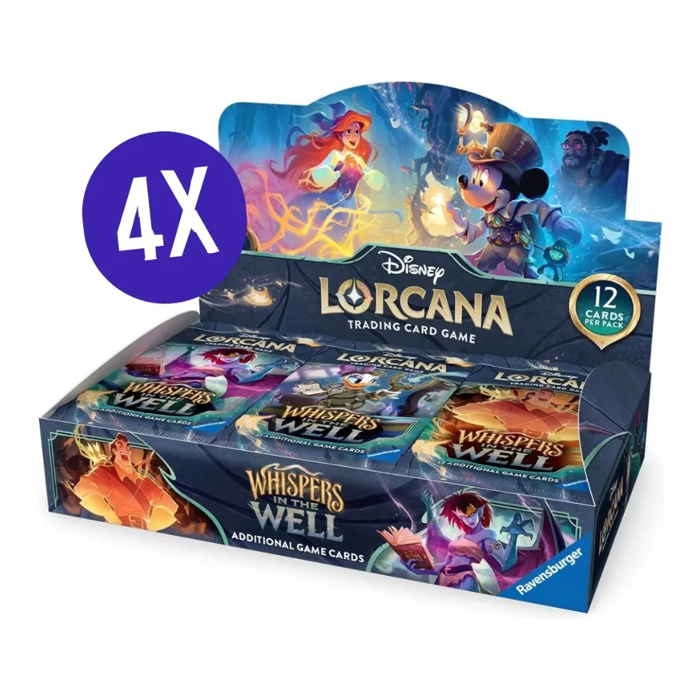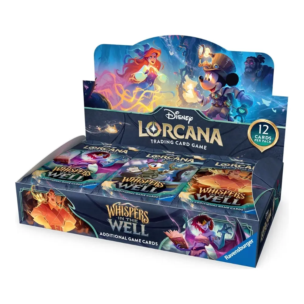 El Illumineer’s Trove de Whispers in the Well es el producto más completo de la expansión, pensado para quienes quieren disfrutar de Disney Lorcana TCG al máximo. Este cofre reúne en un único pack sobres de mejora, accesorios prácticos y un estuche de coleccionista con ilustraciones oficiales de la nueva colección.