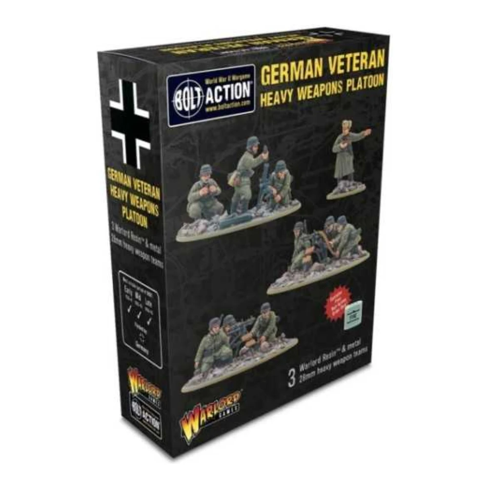 La caja contiene un oficial veterano de infantería alemán de resina de señor de la guerra, dos ametralladoras medias metálicas con tres tripulantes de infantería veterana alemana de resina de señor de la guerra y un mortero medio metálico con tres tripulantes veteranos de infantería alemana de resina de señor de la guerra. También contiene cuatro dados de orden de cerrojo y bases de plástico.