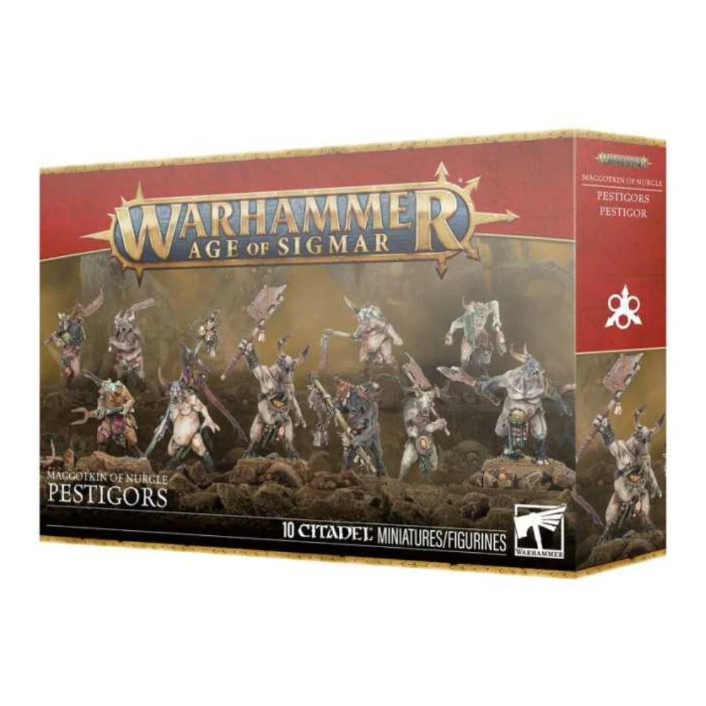 Con este kit multicomponente de plástico puedes montar 10 Pestigors, enfermizos hombres bestia para tus ejércitos de Agusanados de Nurgle de Warhammer Age of Sigmar. Estas criaturas abotargadas y putrefactas están preparadas para marchar al frente de tu ejército, ignorando los golpes del enemigo para sembrar el caos con sus armas corroídas. El kit incluye piezas para montar un campeón, portaestandarte y músico opcionales, ofreciéndole así a tu unidad un cierto grado de personalización.