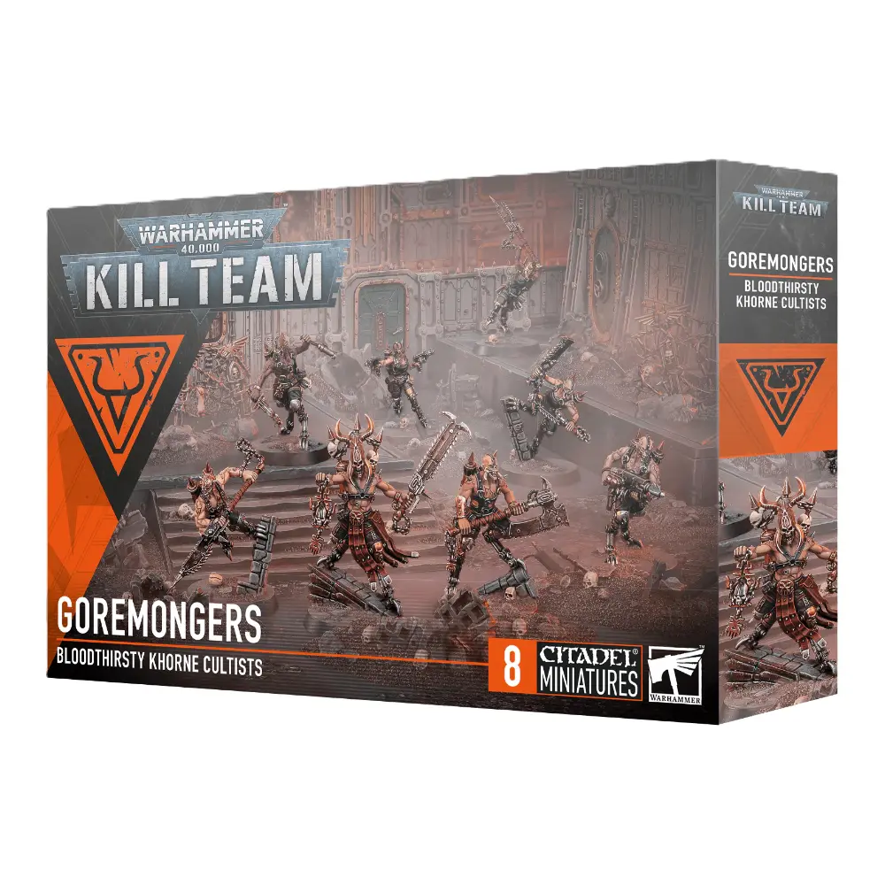 Warhammer 40,000 Kill Team Goremongers Bloodthirsty Khorne Cultists reúne a un grupo de guerreros poseídos por la furia del Dios de la Sangre. Armados con armas cuerpo a cuerpo brutales y equipo improvisado, avanzan sin miedo hacia sus enemigos buscando únicamente la matanza y la gloria para Khorne.