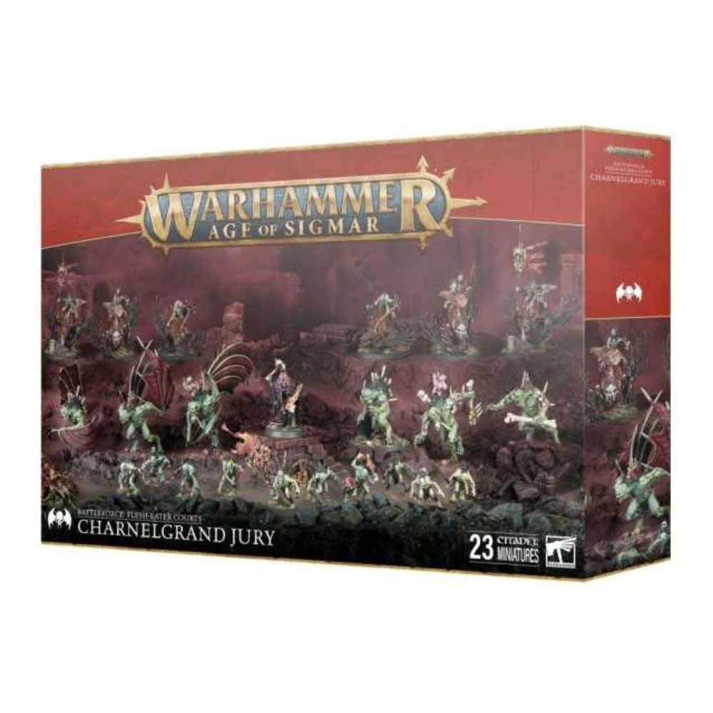 La Charnelgrand Jury es una fuerza macabra de 23 miniaturas de los Flesh-eater Courts, perfecta para desplegar un ejército de Warhammer Age of Sigmar lleno de criaturas caníbales y monstruosidades al servicio de su retorcida nobleza.